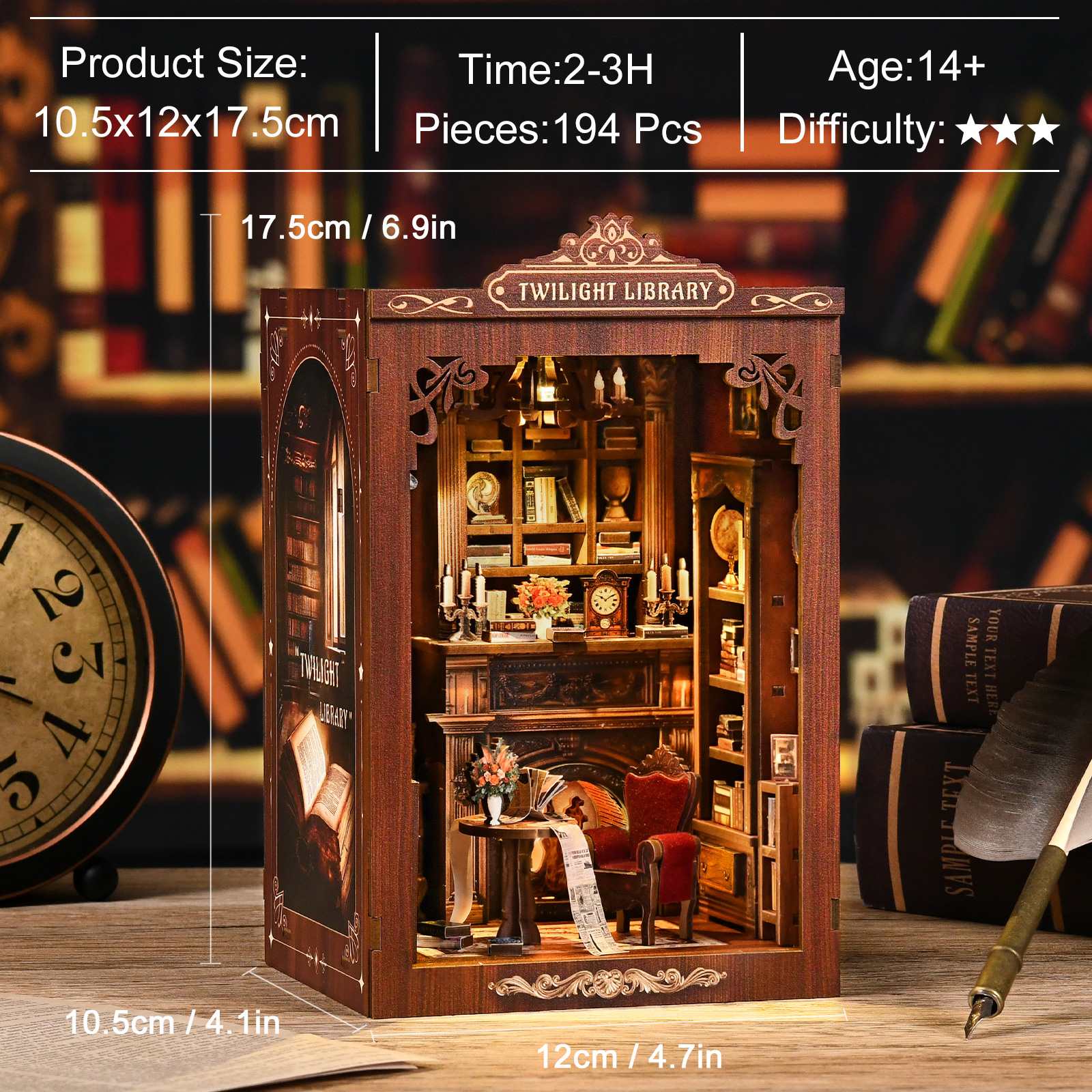 Warm-toned LED lighting creates a cozy reading atmosphere, and the touch-sensitive switch adds both convenience and elegance. A built-in battery compartment makes battery replacement simple and hassle-free. With 194 precision parts and diy miniature dollhouse accessories, this project provides a highly satisfying assembly experience for both beginners and experienced crafters.