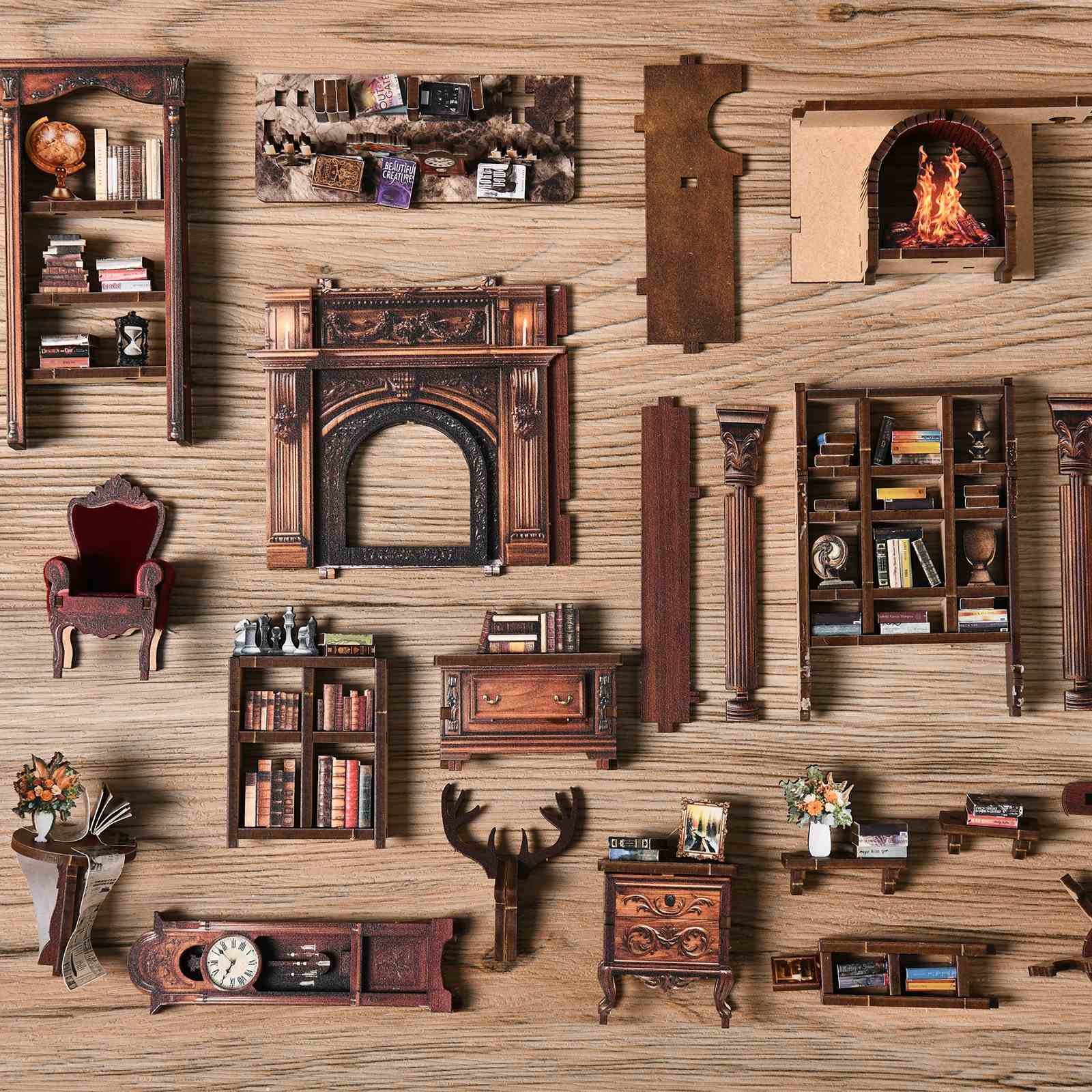 Mini Vintage Scene: Faithfully replicates a classic study room with bookshelves, warm lighting, and miniature decorations.