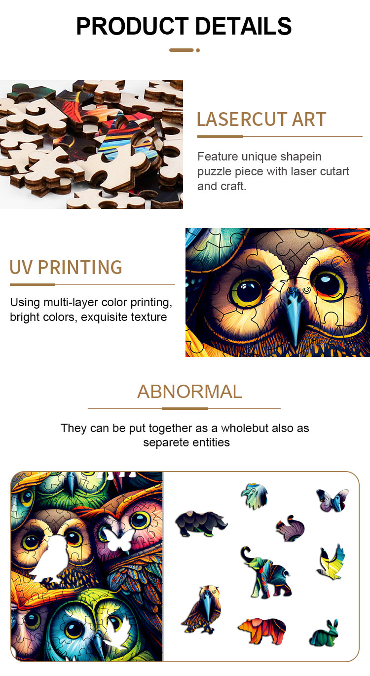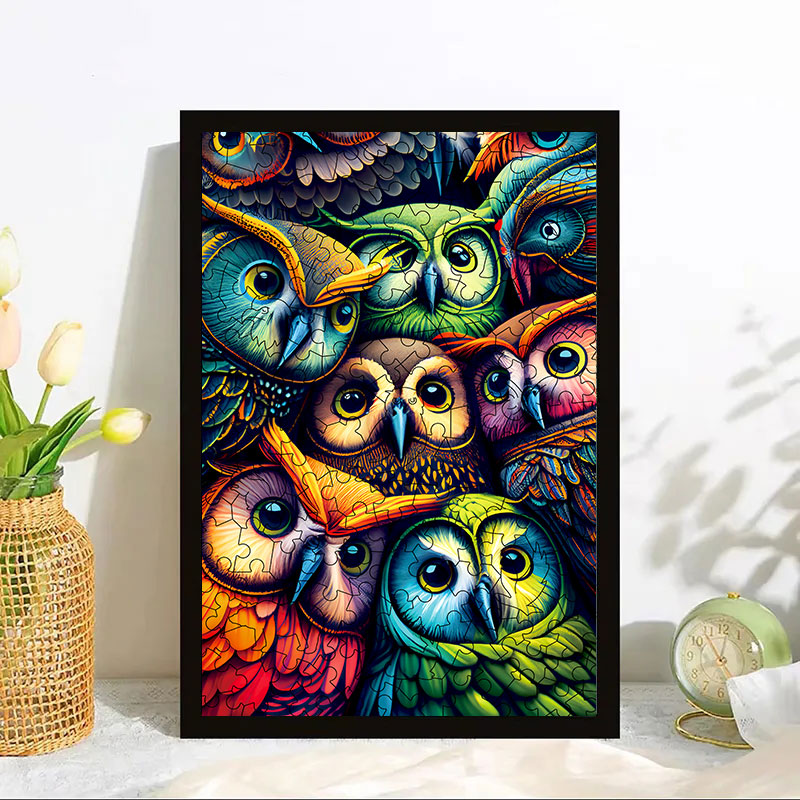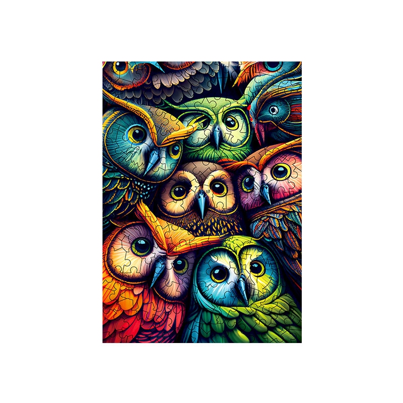 Each piece of this wooden jigsaw puzzle is uniquely shaped, creating a visually stunning and mentally stimulating puzzle game experience. The vibrant UV-printed artwork brings the wise owl to life, offering rich colors, depth, and intricate details that make the finished puzzle a true masterpiece.