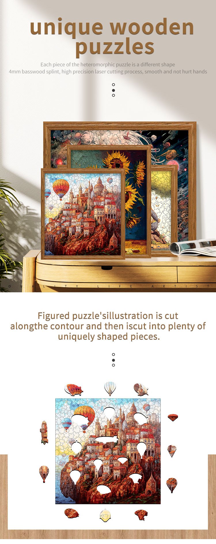A: Each piece is precision laser-cut from 4mm Poplar plywood with unique shapes and vibrant UV printing. The puzzle can be assembled as a whole or as separate decorative pieces.