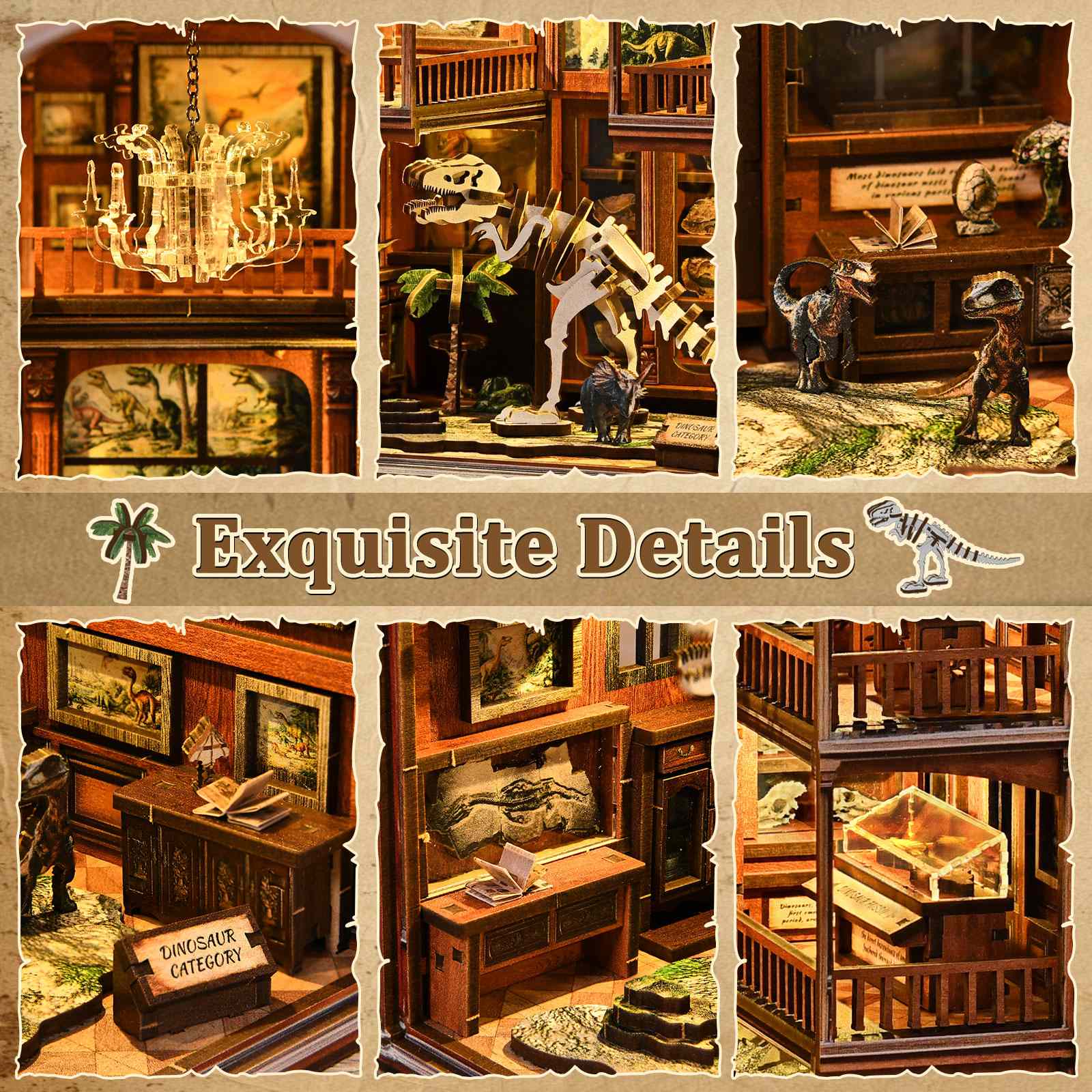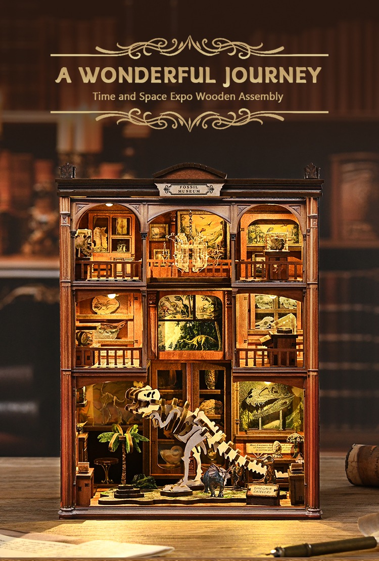 The kit includes everything you need to bring a spotlight book nook or bookshelf alley to life. Whether you're adding character to your home, office, or bookstore, this diorama makes a striking statement piece. Crafting it will take you on a nostalgic journey through time, where fossil skeleton details and acrylic display cabinets transport you to an era long past.