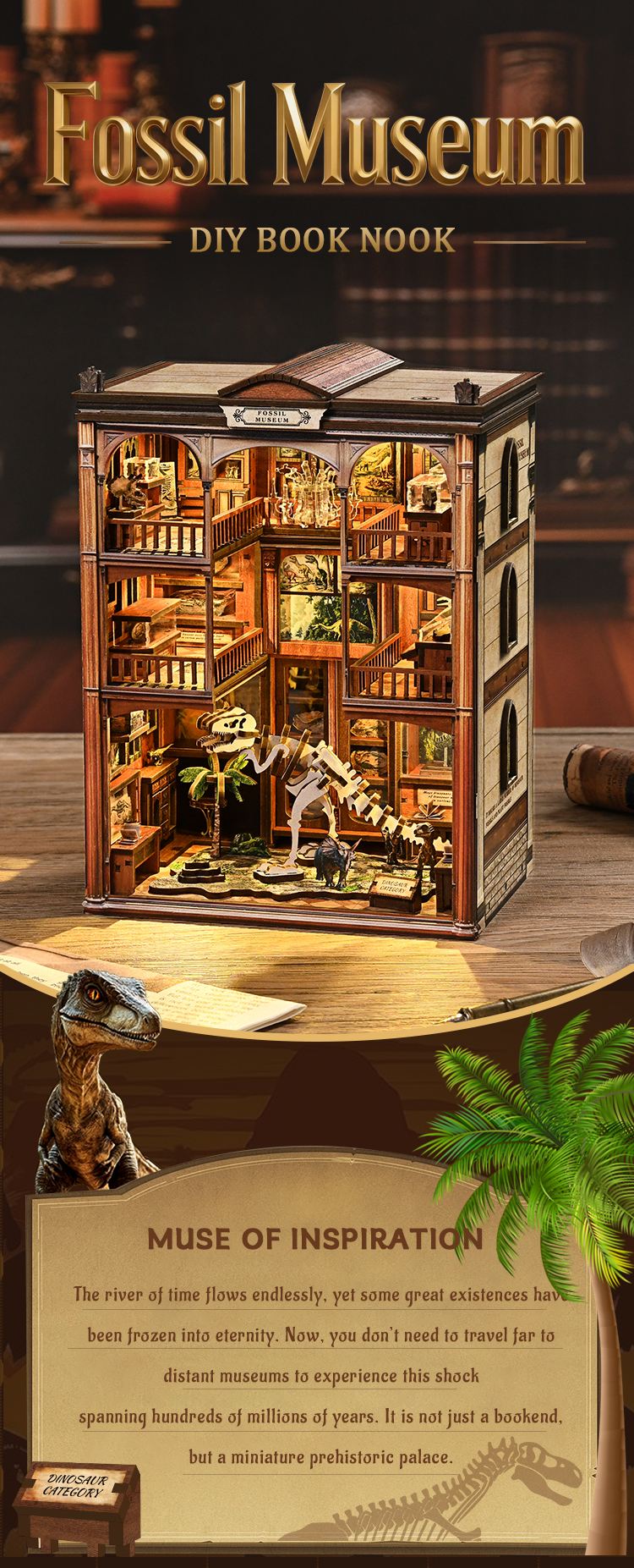 Transform your bookshelf with a spotlight book nook that doubles as a stunning display piece. The fossil museum theme fits seamlessly into any bookshelf alley, adding character and intrigue to your reading space.