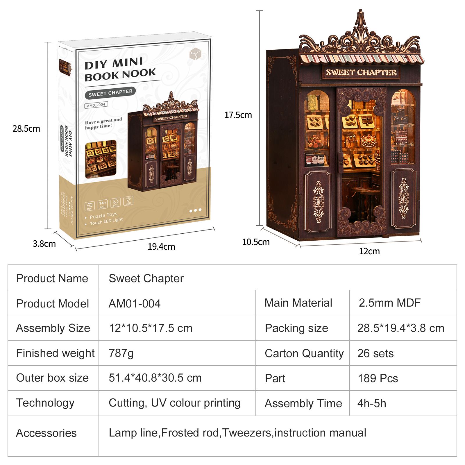 The finished Sweet Chapter DIY Mini House measures 12 × 10.5 × 17.5 cm, making it a charming addition to any bookshelf, desk, or display area. Its compact size allows it to fit seamlessly into your space while still making a statement.