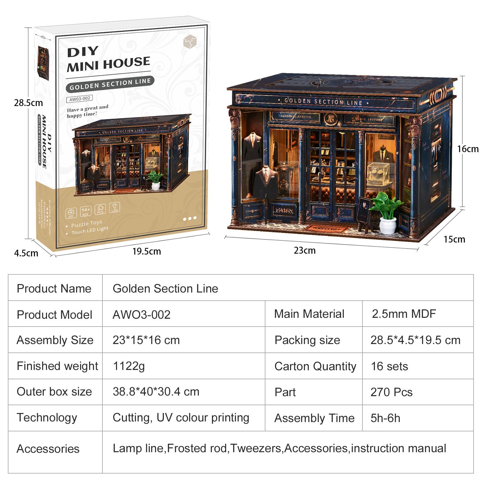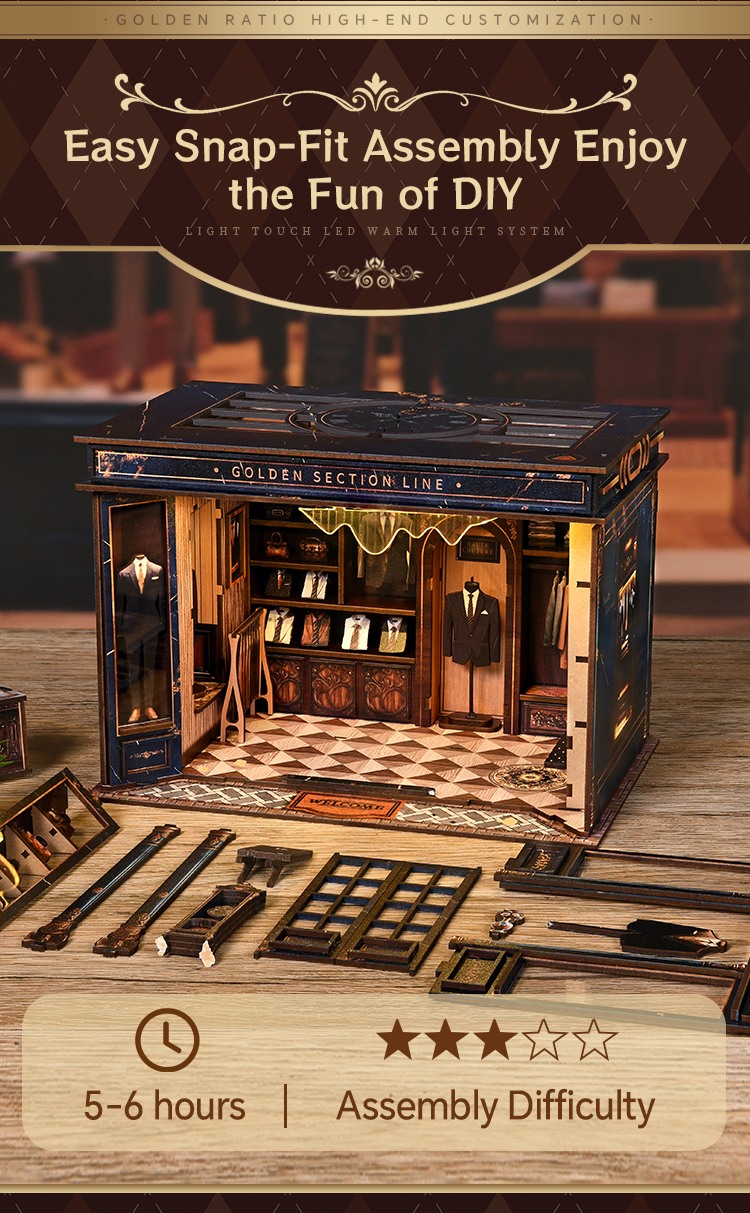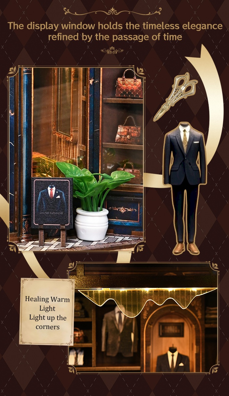 Golden Section Line is a captivating wooden dollhouse miniatures kit inspired by the quiet charm of a vintage tailor shop. In this miniature world, Alice continues her work, waiting for the next customer to walk in and weave their own retro stories.