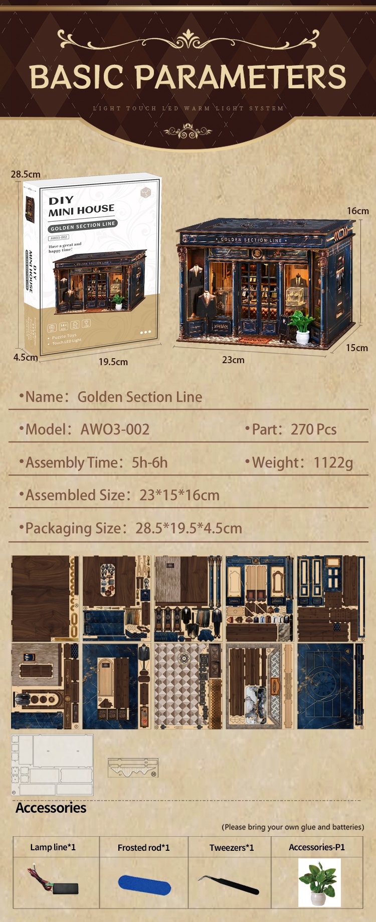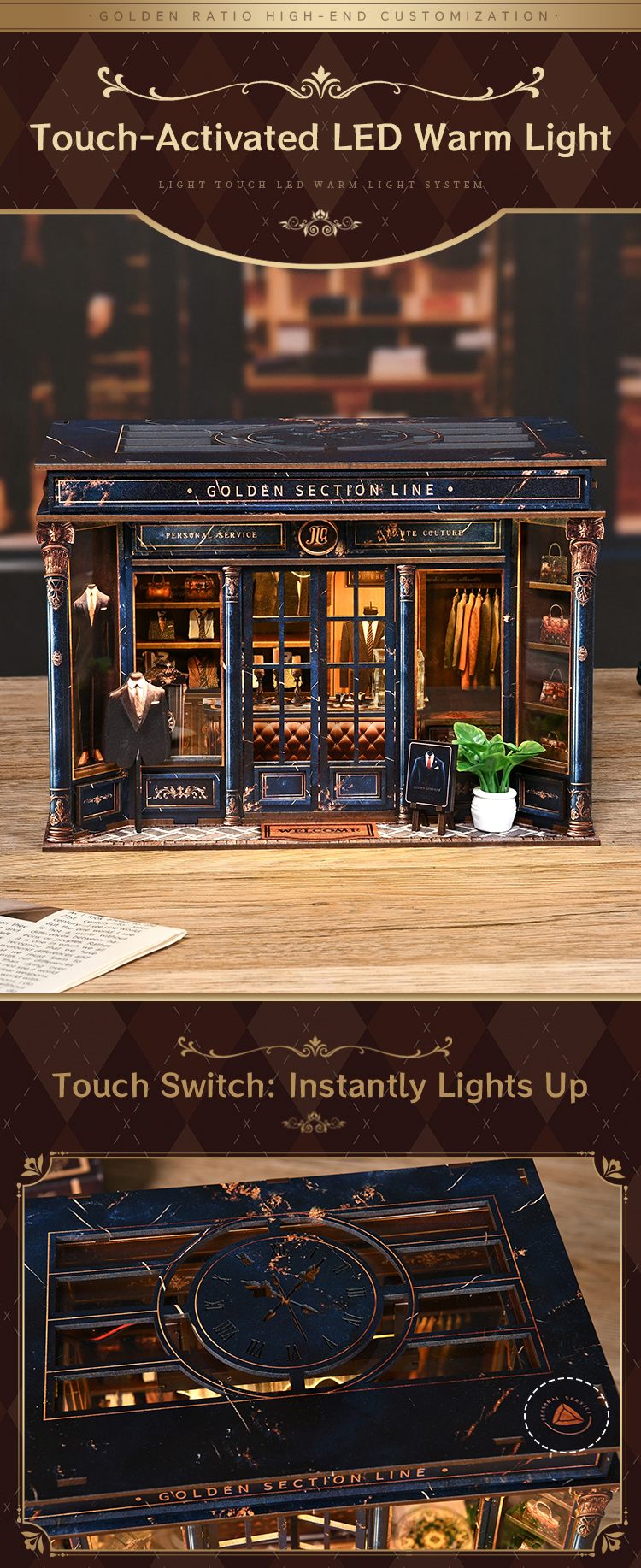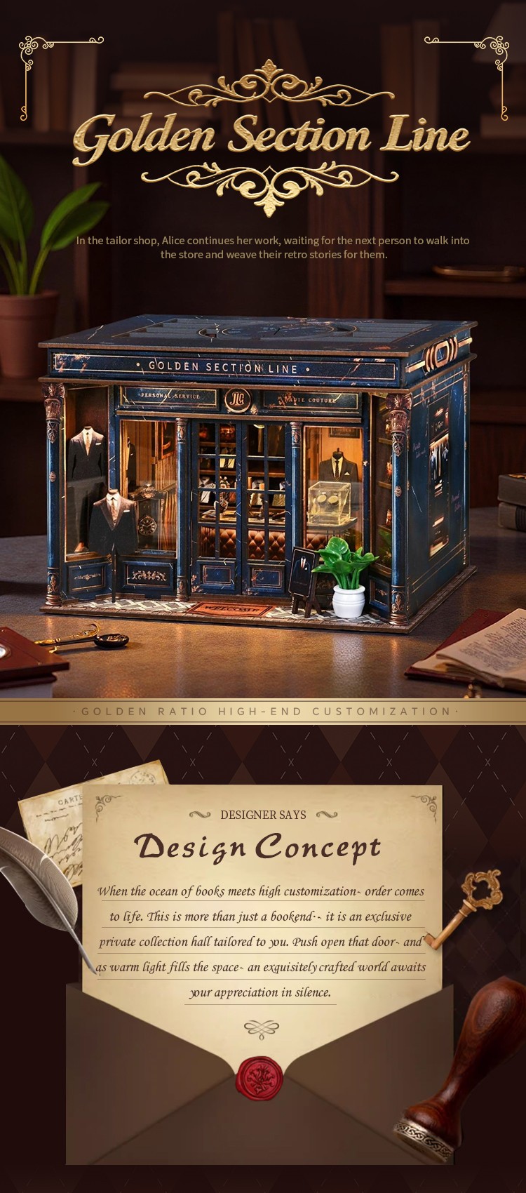 Golden Section Line is a captivating wooden dollhouse miniatures kit inspired by the quiet charm of a vintage tailor shop. In this miniature world, Alice continues her work, waiting for the next customer to walk in and weave their own retro stories.