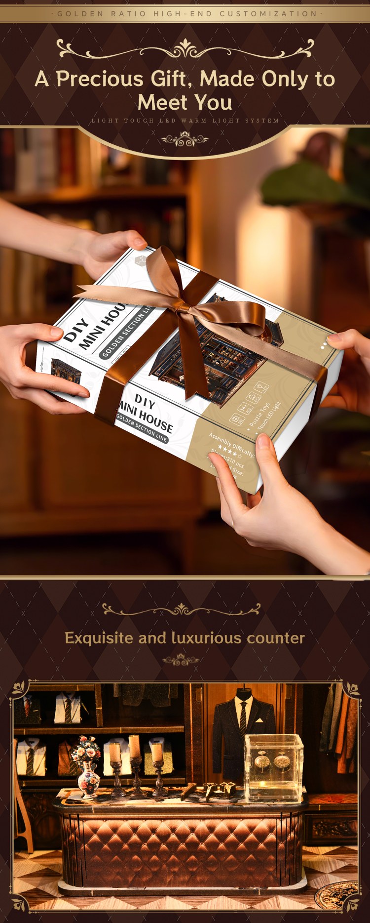 More than just a sweet mini dollhouse, this kit combines the concept of a book nook with miniature artistry. Warm LED light gently spills through the display window, highlighting the timeless elegance and intricate details, creating a quiet yet exquisite microcosm.
