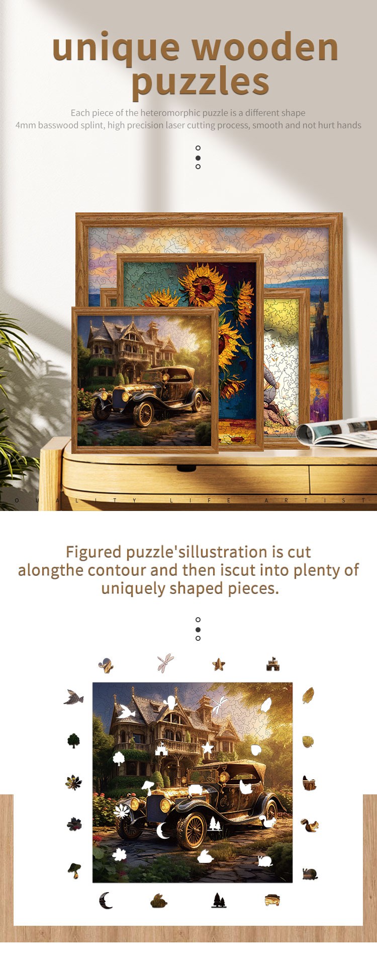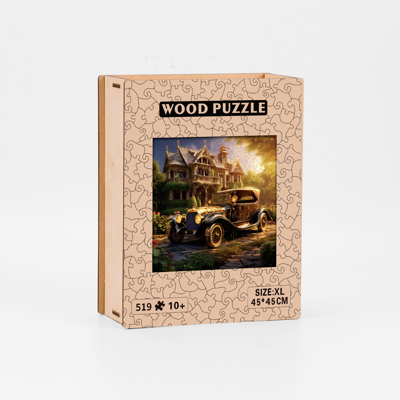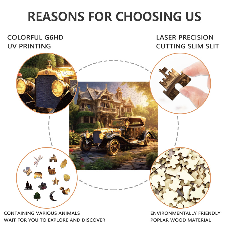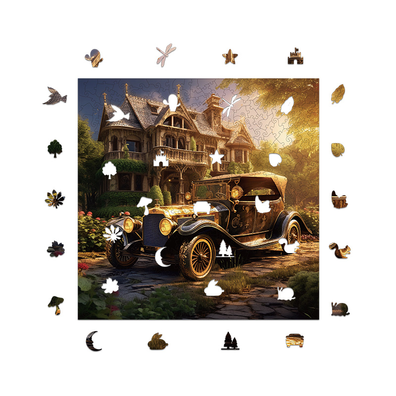 The combination of a grand castle, retro vintage car, golden atmospheric tones, and uniquely shaped wooden pieces makes it stand out from traditional puzzles.