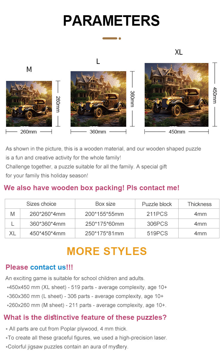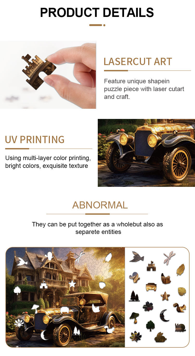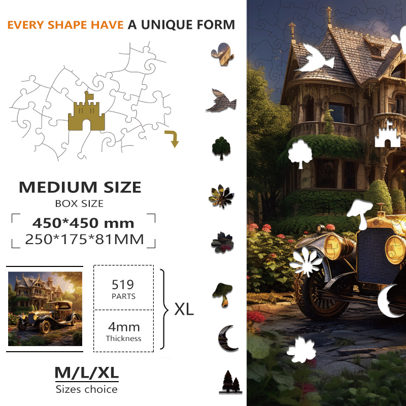 Each silhouette in the illustration is cut along its natural contour, creating uniquely shaped puzzle pieces. The multi-layer UV printing enhances color richness, making the castle and vintage car vivid and full of life. Ideal for adults, families, and collectors, this puzzle offers both a relaxing challenge and an exquisite decorative piece once completed.
